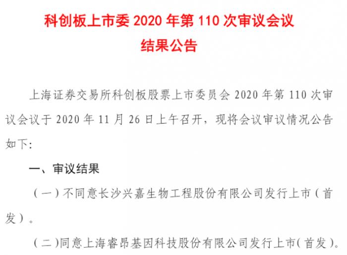 科创板上市委11月26日公告,上海睿昂基因科技股份有限公司首发获通过,长沙兴嘉生物工程股份有限公司首发未通过。