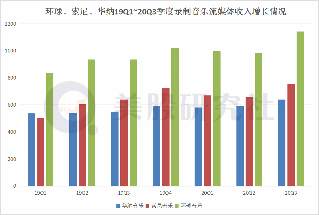 根据美股研究社基于各公司财报整理的数据发现,近两年来环球、索尼和华纳三家唱片公司的流媒体收入在不断增长,其中第三季度环球的录制音乐流媒体收入最多达到了11.4亿美元,其次是索尼有7.55亿美元,华纳最少只有6.39亿美元。