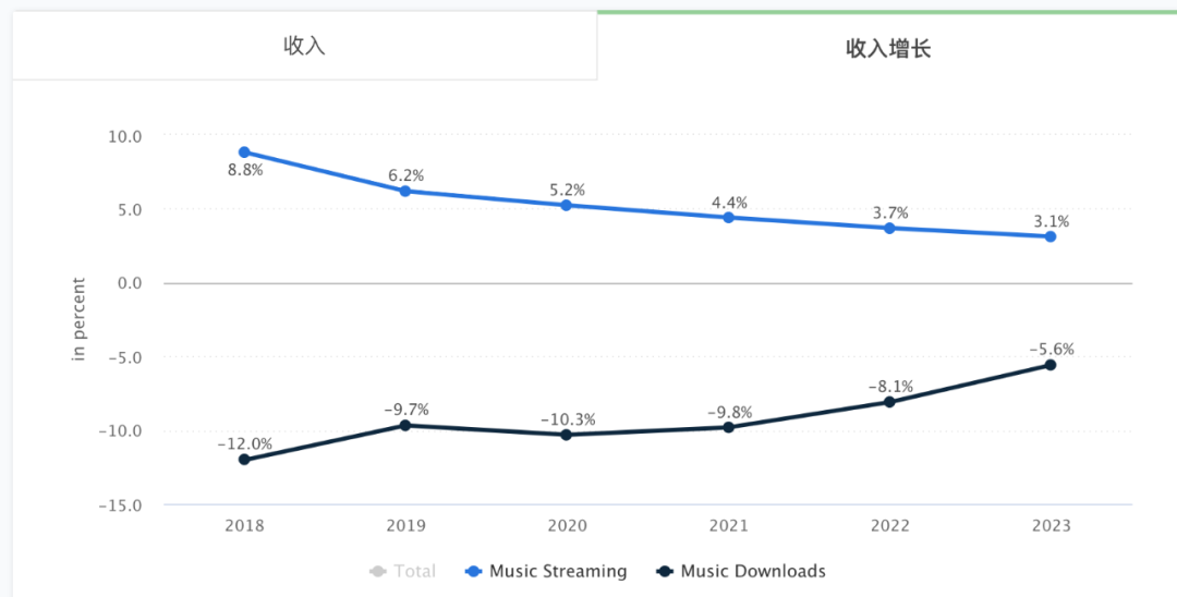 虽然近几年通过spotify等音乐流媒体平台,三大唱片公司营收有不少增长,但实际上依赖于别的平台并不是长久之计。一方面根据数据机构stastista的预测,2018年-2023年,全球流媒体音乐收入增长速率逐步下滑,而音乐下载服务的负增长仍将持续。