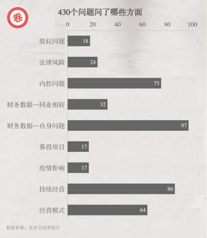 在50次上市委审议会议中,已经抛给首发上会公司的问题一共430个。这些问题关乎财务数据、内控问题、经营等。