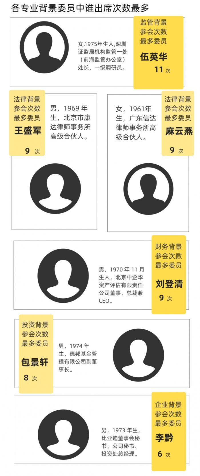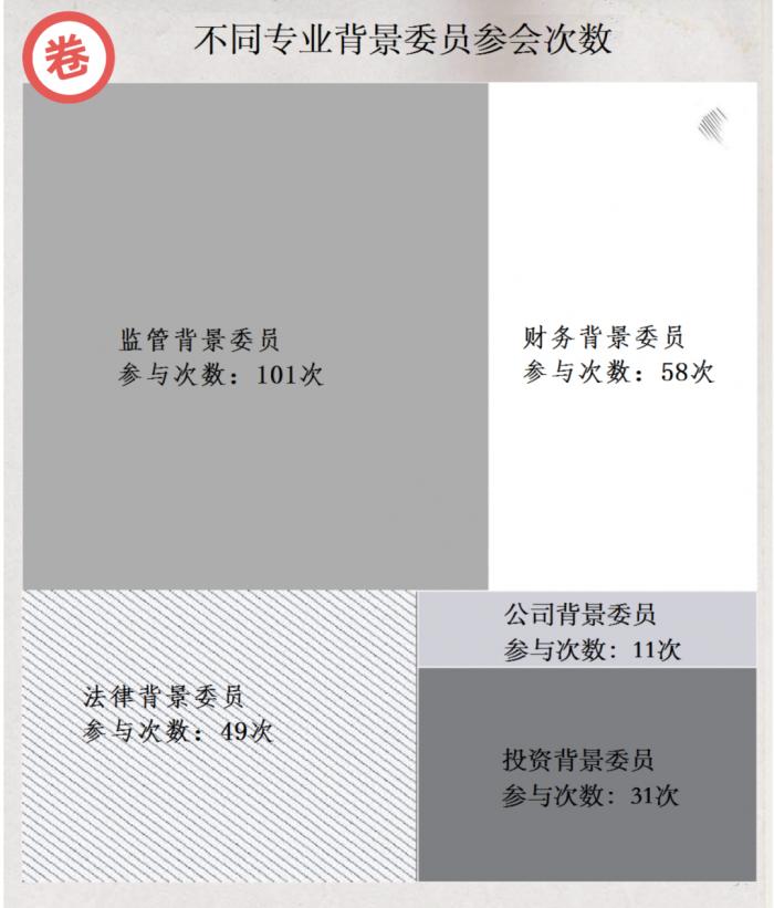 且参会委员的配置多为“2+1+1+1”,即监管背景2人,财务背景1人,法律背景1人,投资背景1人。
