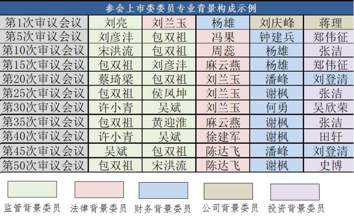 2,综合统计50次上市委审议会议上参会委员的构成后不难发现,“监管”“财务”“法律”三方的人士,几乎在每次“考试”中都会参与。