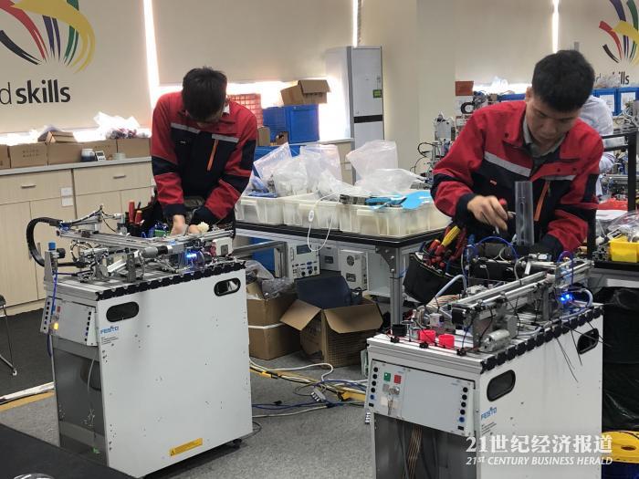 (机电一体化项目参赛选手黄宝顺、丘锦兴正在进行赛前训练,郑玮/摄)