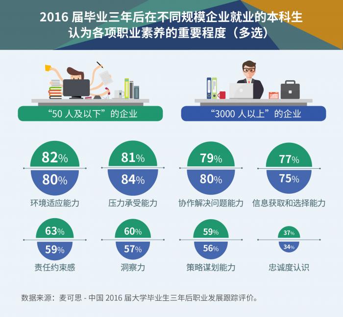麦可思通过对比发现,2016届毕业三年后在小微企业工作的本科生认为“责任约束感”(63%)、“环境适应能力”(82%)、“信息获取和选择能力”(77%)、“洞察力”(60%)、“策略谋划能力”(59%)、“忠诚度认识”(37%)的重要程度,均高于在大企业工作的毕业生。
