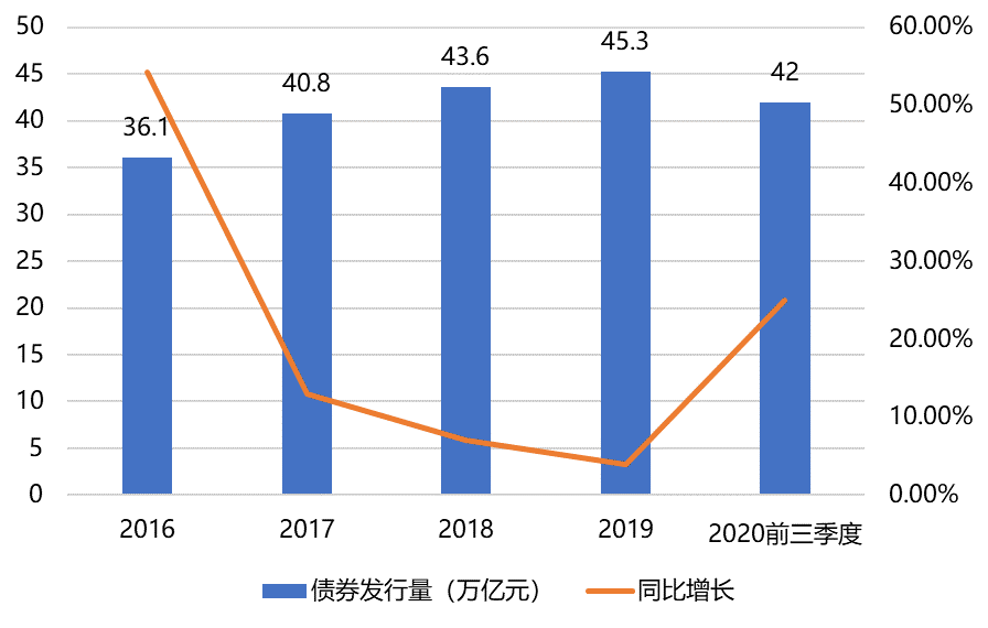 目前中国债券市场总规模已突破100万亿元,总规模居世界第二,仅次于美国。并且发行规模仍然在持续快速增长。在各项举措推动下,我国债券市场年发行量持续增长。今年前9个月,债券发行量达到42万亿元,同比增长25%。2020年第三季度,我国债券市场共发行各类债券12886期,同比增长11.01%,增速较上年同期放缓3.49个百分点;发行金额也较上年同期实现快速增长,三季度发行金额合计16.42万亿元,同比增加4.38万亿元,同比增长36.32%,增速较上年同期提高37.56个百分点(数据来源:Wind)。