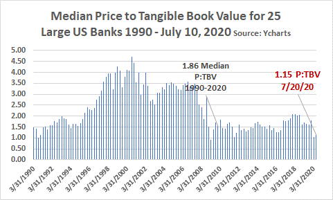 图片来源:Ycharts而从1990年以来,美国25家大银行的有形账面值比(PTBV)的中位数来看,截止今年7月份,美国银行业整体处于被低估的状态,短期内有投资的价值。