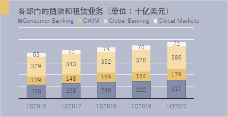 美国银行相对其他银行来说,在第二季度表现优异。从财务表现看,美国银行的营业收入和每股收益都远高于市场预期,可以看出公司运营和经营维持在稳定的状态;从美国银行的资本充足率达到了11.6%,高于监管的要求(9.5%),这说明美国银行有充足的资金去应对坏账和股利支付,避免了可能因为资金断裂造成破产的可能。除此以外,美国银行可以以低成本吸引存款。其中三分之一以上的存款是无息存款,计息存款的平均收益率仅为0.47%,在美国银行业中最低,相比之下,摩根大通和富国银行的计息存款平均收益率较高,分别是0.52%和0.71%,再加上美国银行多样化业务的发展策略,分散了经营风险,比如美国银行大部分的贷款是房屋抵押贷款和信用卡,很少涉及石油行业,因为不会受到低油价水平的负面影响,如下图所示,公司的贷款和租赁业务在部门的发展,呈现稳定上升趋势,另外美国银行有遍布全世界的专营权和多元化的业务组合,这也会让公司在抵御全球经济危机中受益。