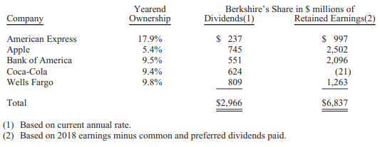 伯克希尔在2019年对美国银行的增持除了支付股利外,更重要的是巨大的赚钱能力,如下图所示,根据这样的指标,公司的前五大公司都是符合这样的特征。特别是美国银行,留存收益在公司前五大持股中仅次于苹果公司,也可以看作是公司价值投资理念的体现,而且伯克希尔倾向占有公司的5%到10%,而且长期持有获利。