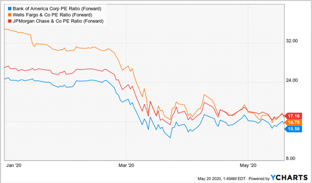 与竞争对手富国银行和摩根大通相比,美国银行股价相对便宜。如下图所示,公司的远期市盈率最低,达到了15.6倍,而摩根大通最高,达到了17.16倍,到2022年,美国银行预计会产生每股2.70美元的收益,而按照五年平均市盈率的14倍计算,美国银行的股价理论上应该是37.80美元(2.7 x 14),较当前的25.77美元的价格有47%左右的上涨空间。