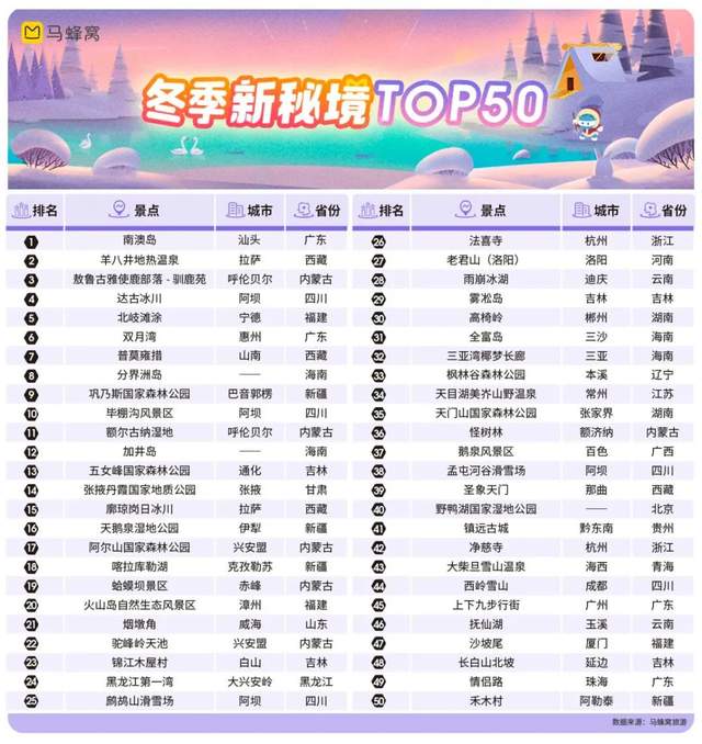 入冬后除了带来刺骨的寒风外,如期而至的冬季旅游也拉开序幕,冰雕、滑雪、温泉、反季节海岛游都成为游客热衷的旅游项目,而与过往市场不同的是,越来越多小众旅游目的地被挖掘出来。根据马蜂窝11月27日发布的《冬季新秘境2020》榜单显示,南澳岛、羊八井地热温泉、敖鲁古雅使鹿部落等成为这个冬天最受游客青睐的旅游目的地。