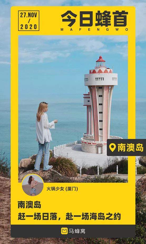 进入冬季后,地处南方的南澳岛热度持续上升,成功拔得“冬季新秘境2020”榜单头筹,成为最受游客关注的“冬季新秘境”榜首,为了进一步推广这个新兴目的地,11月27日当天马蜂窝APP还特别推送了来自旅行达人@火锅少女的“南澳岛游记”作为当日蜂首,让用户看到榜单之后,能第一时间了解到最实用的旅游信息。