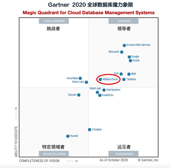 根据环球网的报道,11月24日,国际知名行业研究机构 Gartner 公布 2020 年度全球数据库魔力象限评估结果,阿里云首次挺进全球数据库第一阵营——领导者(LEADERS)象限。数据库与芯片、操作系统并列为全球技术三大件,也是企业IT系统必不可少的核心技术,银行、电信、制造、互联网等主要行业都依赖于数据库技术。