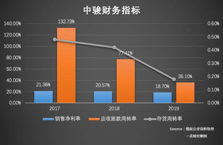 这种“注水式”的增长并不能带来利润率的同步上升。2017-2019年,中骏销售净利率不断下滑,存货周转率和应收账款周转率也逐年下滑。
