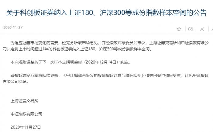 据悉,下一次样本定期调整将于2020年12月14日正式生效。届时,上证180、沪深300等规模指数中有望首度出现科创板证券的身影,指数的市场代表性将进一步提升。