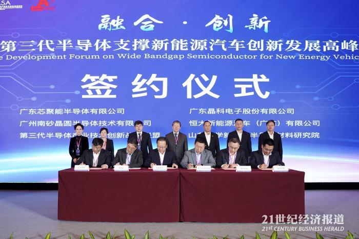 论坛期间,广东芯聚能半导体有限公司、广东晶科电子股份有限公司、广州南砂晶圆半导体技术有限公司、恒大新能源汽车(广东)有限公司、山东大学新一代半导体材料研究院、第三代半导体产业技术创新战略联盟代表6家首批发起单位共同签约,以实质推进广州市南沙区第三代半导体创新中心建设。