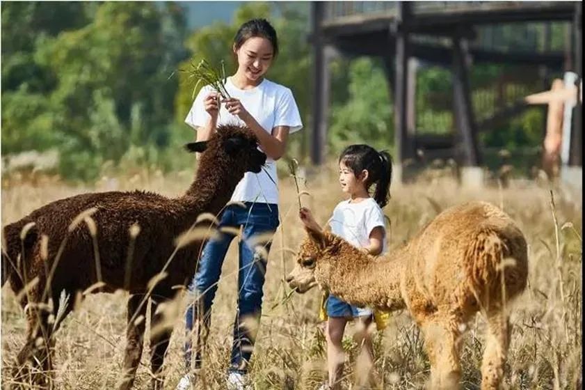 除了室内活动外,度假村的教育农场也是亲子活动的不错之选。教育农场占地100亩,是一个让大人和孩子亲近自然,与动植物互动,从体验中获取知识的奇妙农场。在农场,孩子们可以告别电子产品,用眼睛和双手感受大自然的神奇。拥抱羊驼、喂食梅花鹿、下田地采摘有机蔬菜等。在这里,人们可以暂时放空,拥抱自然乐趣。