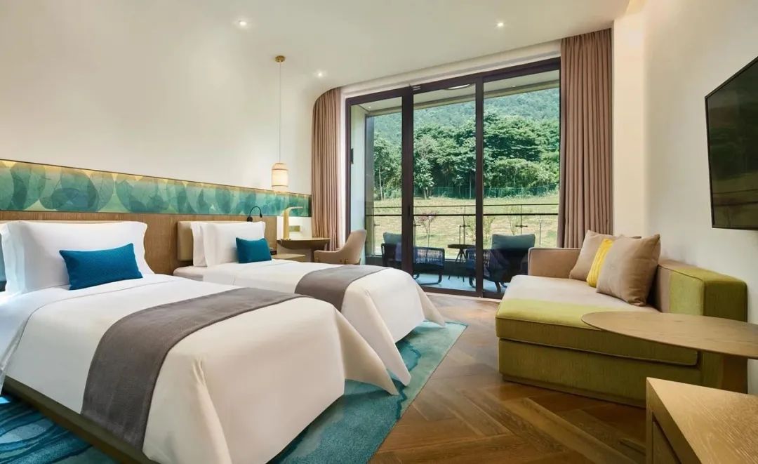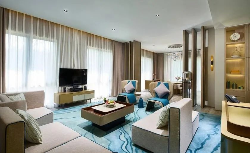 除了外部多样化的体验,整洁舒适的居住房间与餐饮服务也是度假村必不可少的配置。度假村现有300间客房,包含196间高级房、70间尊享豪华房、33间套房、1间总统套房。度假村内每间客房均采用好莱坞式床设计,可任意切换大床、双床,为接待不同类型的散客、团队提供便利。