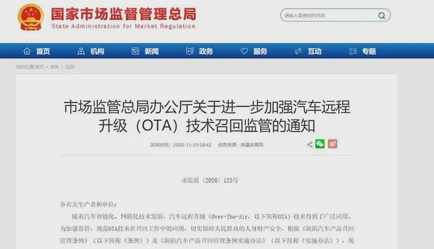 市场监管总局办公厅印发《关于进一步加强汽车远程升级(OTA)技术召回监管的通知》。通知提出,市场监管总局质量发展局将组织相关单位加强汽车OTA安全监管技术研究,探索建立OTA监管数据平台,组织开展OTA安全技术评估,并加强相关的召回监督工作。如发现生产者存在未按规定备案有关信息或召回计划、不配合缺陷调查、隐瞒缺陷或未按照已备案的召回计划实施召回等违法行为的,将严格依法处理。