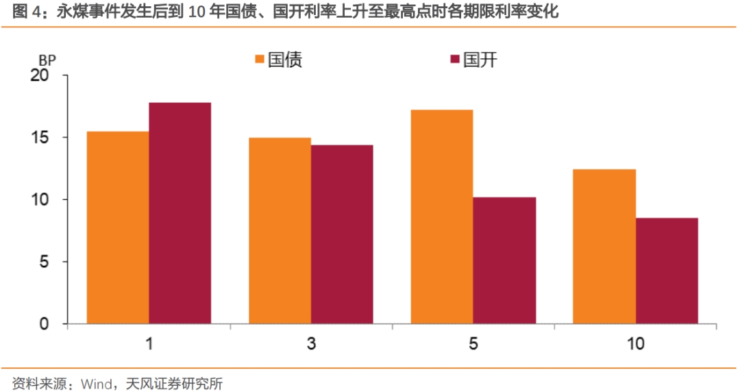 另外,还有一个现象值得说明,永煤事件发生后短端(1年)国开较国债上升幅度更大,长端(5、10年)则是国债上升幅度更大。这是由于现在机构久期偏短,因而赎回影响集中于流动性更好的国开债短端,而银行负债结构问题导致国债长端调整较多。