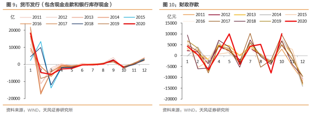 年末通常财政支出力度较大,12月份财政存款通常会有季节性下降。不过,今年在疫情影响下情况比较特殊,因而年末财政存款变化仍要考虑两方面因素。