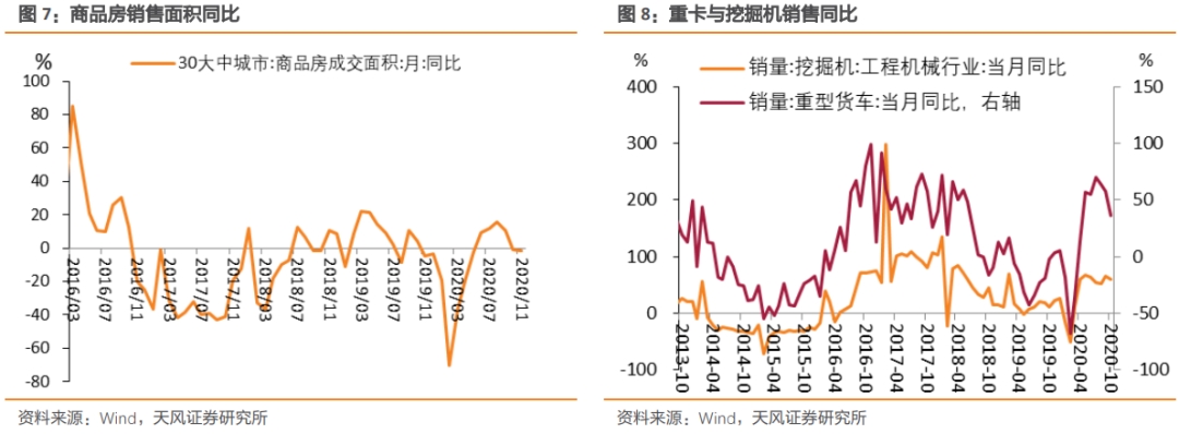 最新数据显示挖掘机、重型卡车以及房地产销售增速已经连续两月放缓,侧面显示居民和企业的贷款需求可能有所减弱。不过,根据此前易纲行长提到的全年20万亿新增贷款预测,全年贷款增速可能在13%左右,而结合高频数据我们判断11月贷款增速在12.9%左右(与10月持平),不过该增速仍明显高于去年。