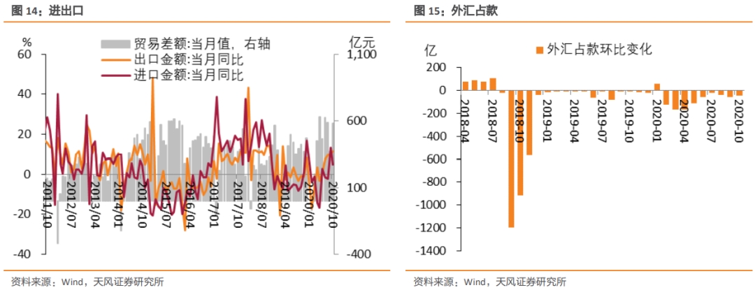 另外,最近几个月我国出口情况继续超市场预期,带来经常项目大幅顺差,对外汇占款也形成一定支撑。