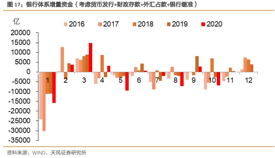 综上所述,在不考虑央行投放的情况下,我们预估12月银行体系增量大概率会在3000-3500亿元左右,较2017、2018、2019年表现偏弱。