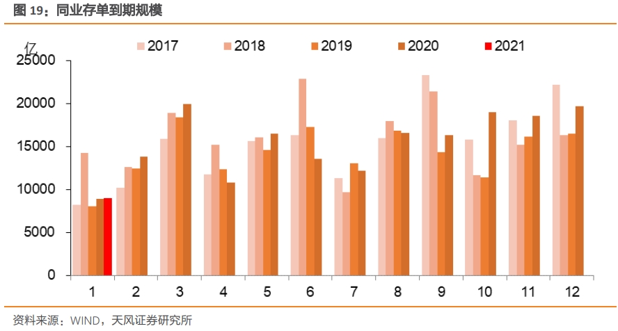 不过,从同业存单的角度来考虑,12月份仍有较大规模的同业存单到期,且到期规模明显高于前两年同期,这意味着年末同业存单发行压力仍存(明年1月到期规模与今年基本持平)。