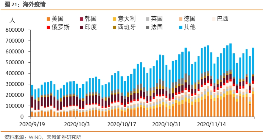 另外,海外疫情研发好于市场预期。11月美企辉瑞(Pfizer)与莫德纳(Moderna)先后宣布各自的候选疫苗有效性超过90%,而英企阿斯利康(AstraZeneca)公布其与牛津大学合作研发的候选疫苗预防新冠病毒方面平均有效性达70%,在较少剂量的方案中该疫苗的有效性达90%,全剂量方案的有效性则为62%[7]。整体来看,虽然仍存在质疑(比如钟南山称辉瑞疫苗试验结果远远不够,保护率不是唯一指标[8]),但海外疫情研发情况确实好于市场预期。
