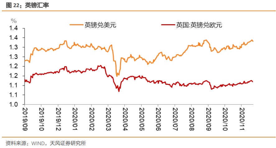 目前脱欧谈判结果仍未明朗化。此前欧盟首席谈判代表巴尼耶提出除非英国愿意就关键问题做出让步,否则将退出英国脱欧谈判[9]。欧盟委员会主席冯德莱恩面对媒体指出现在尚无法给出英国脱欧谈判达成协议的具体时间节点预期[10]。英国财政部长桑纳克26日则提出,英国不应不惜任何代价达成英国脱欧协议。另外,欧盟和英国将会在本周末重启因新冠肺炎疫情而中断的面对面脱欧贸易谈判。