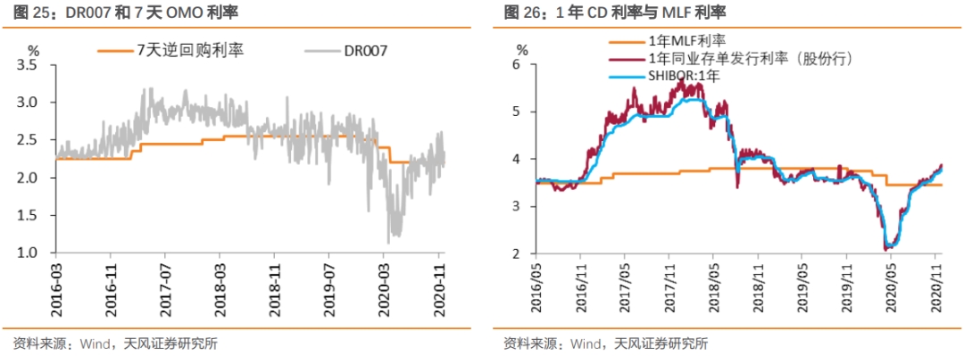 综上所述,我们认为在年底12月和春节前1月可能出现季节性流动性紧张的时间段,央行仍会精准投放MLF和OMO进行对冲,流动性整体保持紧平衡而不会简单收紧,DR007继续围绕7天OMO利率波动,CD利率逐步上升的势头可能会有所变化。