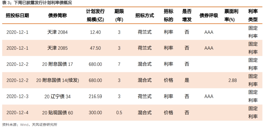 根据已公布的利率债招投标计划,从11月30日至12月6日将发行6支利率债,共计1936.49亿,其中国债3支,地方政府债3支。