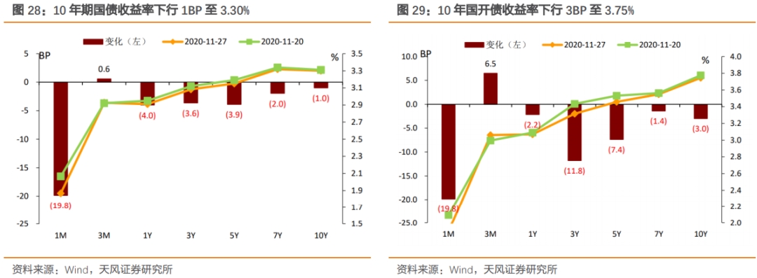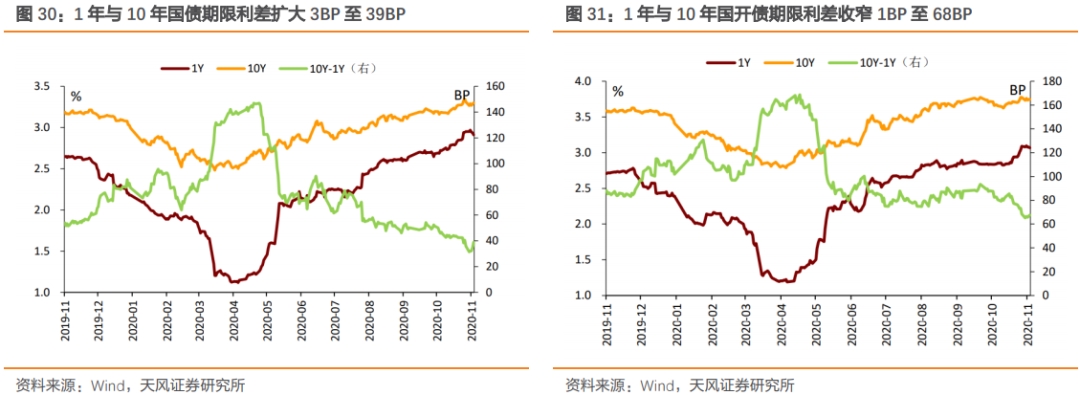 本周长债收益率先下行后上行。全周来看,10年期国债收益率下行1BP至3.30%,10年国开债收益率下行3BP至3.75%。1年与10年国债期限利差扩大3BP至39BP,1年与10年国开债期限利差收窄1BP至68BP。