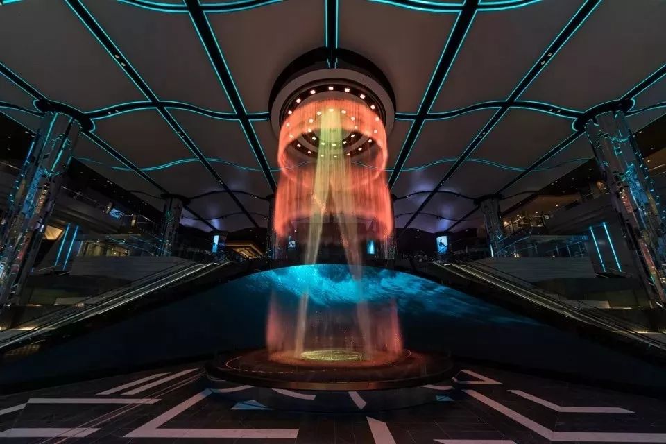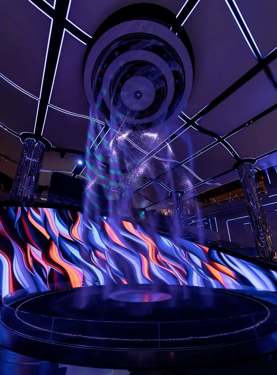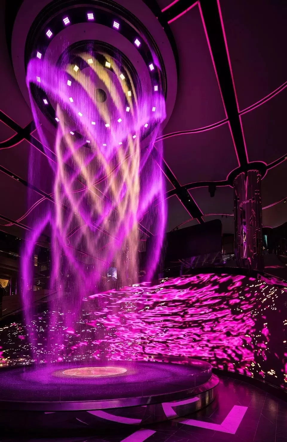 13米高的圆柱形装置通过编程呈现出不同造型的瀑布,各种形态的水雾画面从天花板顶部飞泻而下。在灯光的渲染下,宛如在空中轻盈跳舞的仙女,为整个空间赋予一种由光线、镭射与投影带来的优雅与动感之美。