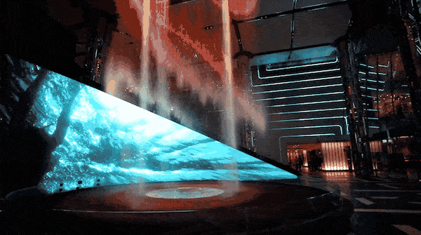 除了中央的巨大画面外,变化的光线图像作为数字画布的延伸,流动在天花板、墙壁以及空间中的水景当中,将画布上的数字艺术内容扩展至整个两层高的大厅空间。