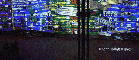 第二个时间较短,投射的是维也纳当代大师百水Friedensreich Hundertwasser的作品。Hundertwasser的绘画是一种颜色的爆炸,它以无尽的螺旋运输到生命和自然元素的源头,空间变成了数字化图像的碎片化旅程。颤抖的窗口动画与华丽的色彩几何图形变现了一个设计中的乌托邦。