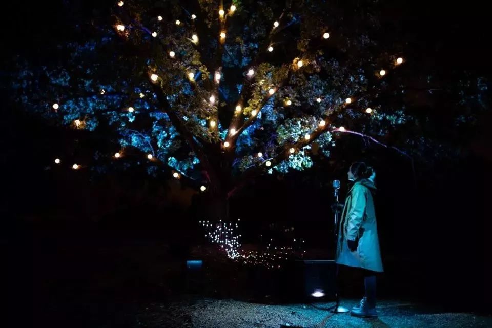 耳语树(Whispering Tree):彩色闪烁的灯光装置,将樟树变成梦境中的精灵之树,沿着树根延绵数里的光道像是精灵的尾巴,美丽的铺洒开来。它们邀请游客们歌唱,树木灯光的频率、色彩随着歌声的变化而变化,展示出橡木独特的语调。