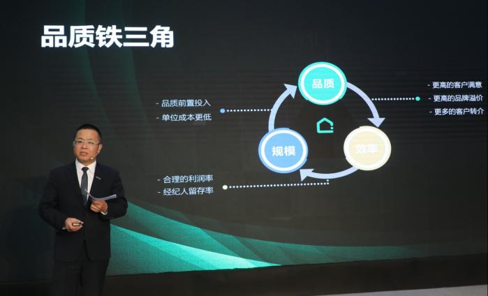 链家把这一逻辑概括为“铁三角”模式,即通过好的服务品质,带动效率提升,进一步带动规模增长。规模上去后,链家反过来可提供更优质的服务,人均效益更高,更有加大品质投入的底气。