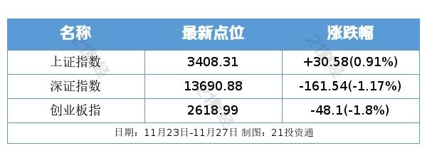 过去一周(11月23日-11月27日),沪指上涨0.91%,为连续上涨的第二周;深证成指下跌1.17%;创业板指延续弱势态势,本周下跌1.80%,已连续下跌三周。
