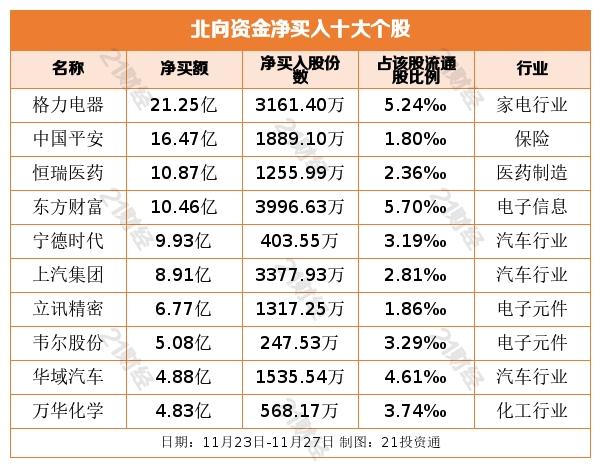 个股方面,格力电器(000651.SZ)深受北向资金青睐,已连续7个交易日被净买入,本周获净买入21.25亿元,近一个月获买入60.32亿元。