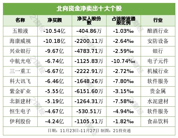 当周北向资金净卖出五粮液(000858.SZ)、海康威视(002415.SZ)、兴业银行(601166.SH)、中航光电(002179.SZ)、三一重工(600031.SH)居前。