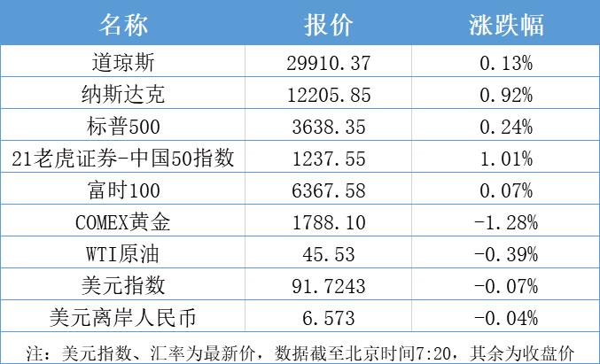 上周五,美股三大股指集体收涨,道琼斯指数涨0.13%,报29910.37点,周涨2.21%;纳斯达克指数涨0.92%,报12205.85点,周涨2.96%;标普500指数涨0.24%,报3638.35点,周涨2.27%。