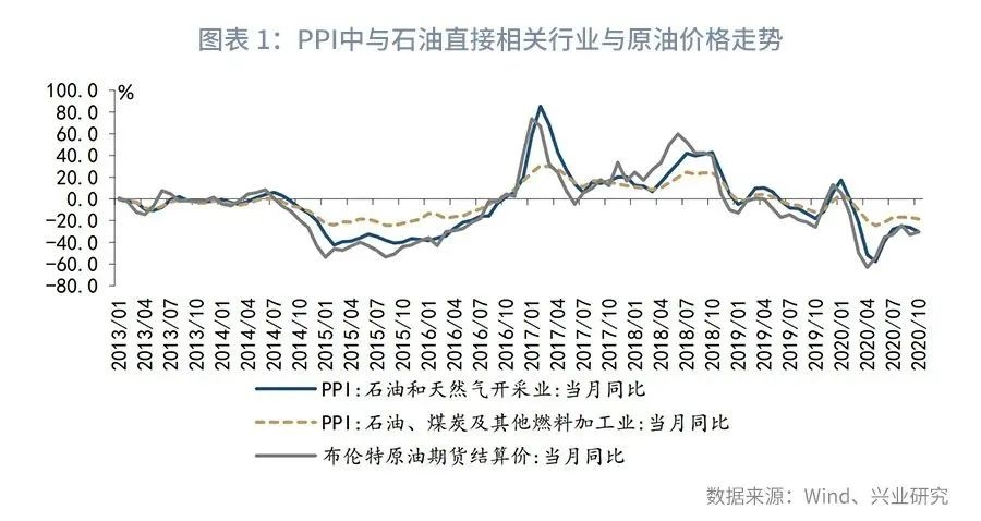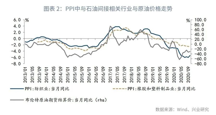 当前PPI受油价拖累,不能客观反映工业品价格上涨的局面。10月石油和天然气开采业、石油、煤炭及其他燃料加工业出厂价格分别同比下降30.4%、18.5%,跌幅较9月进一步扩大,而这两个行业出厂价格下跌主要受国际原油价格走势影响,油价低迷或将继续拖累PPI下行。同时,油价还会通过影响工业产品成本影响PPI相关分项走势。原油作为大宗商品之母,经过工业化生产之后会产出汽柴油、沥青等重要石化产品,进而影响纺织服装、轮胎、塑料制品等行业,原油自上而下的影响工业产品的成本,PPI橡胶和塑料制品业和纺织业分项与油价同比走势基本一致。原油加工较长的产业链和能源原材料价格在PPI中的较大权重使原油价格对PPI有较强的影响,因此PPI读数或无法准确反映当下工业品涨价的环境。