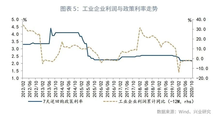 另外,值得注意的是,工业企业利润同样对政策利率的变化具有一定的信号意义。数据显示,滞后12个月的工业企业累计利润同比与7天逆回购利率走势基本一致,显示在工业企业利润持续上升的背景下,即使PPI仍处低位,货币当局亦有调升政策利率的可能,典型例子如2013年,彼时PPI同步多处于负值区间,但工业企业累计利润增长可观,货币政策偏紧,央行两次调升7天逆回购利率。