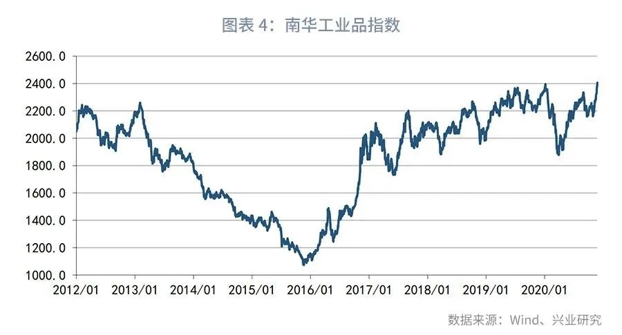 通过国家统计局公布的50种流通领域重要生产资料市场价格变动情况并计算各工业品的涨价比例,可以观察工业品价格的上涨情况。历史数据显示,过半重要工业品上涨的情况下,货币当局亦有调升逆回购政策利率的可能。典型例子如2017年初至2018年3月的加息周期。从当时的情况看,2016年7月后一半以上工业品价格出现持续大幅上涨,但PPI同比在此期间基本位于0%-2%间波动,并未明显出现通胀预期上升的迹象,加之彼时国内经济增长重新恢复上行和金融去杠杆的要求,央行在进行“收短放长”之后,上调了7天逆回购利率。到了2017年第四季度,工业品价格再次出现了过半上涨的局面,而央行同样两次上调7天逆回购利率共10bps,显示出在PPI指引性较弱的时期,工业品价格或成为货币当局是否收紧货币政策的考量之一。当前同样出现了PPI维持低位但多数工业品上涨的局面。11月以来,钢铁、水泥等多数工业品价格延续上涨态势。高频监测数据显示,11月中旬全国流通领域9大类50种重要生产资料中36种产品价格上涨,上涨工业品种类相比上旬进一步增加。铜价突破2017年底高点,其他工业大宗商品上涨趋势愈发强烈,使得南华工业品指数突破2400,创出2012年以来新高。