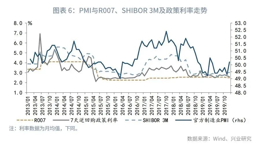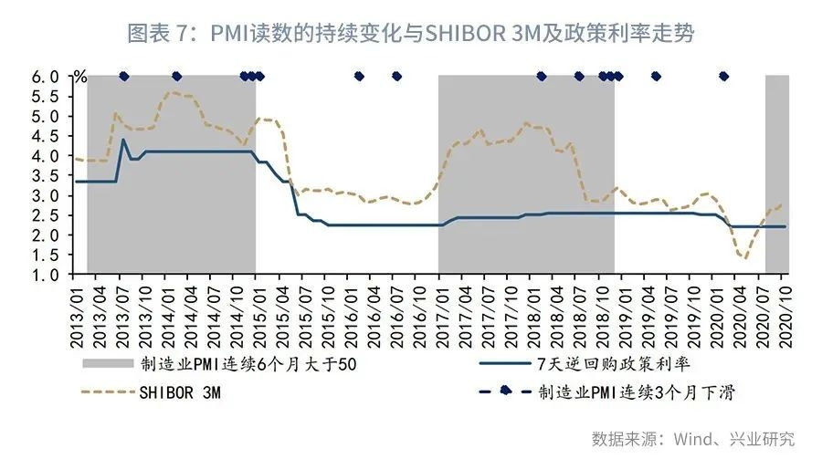 另一方面,当PMI连续3个月呈现下滑,此时加息周期大概率结束,Shibor 3M的下行通道很快将会打开。进一步地,如果PMI持续下滑的同时还跌破了50的荣枯线,那么央行有可能启动降准等宽松操作。例如,2014年10月起PMI逐月下滑,至2015年1月跌破50至49.8,央行于2015年1月便下调7天逆回购政策利率,2月初更进一步开展了降准操作;2018年9月起PMI连续下行,并于12月跌破50至49.4,这次央行虽然没有调降政策利率,但于2019年1月初宣布全面降准。其他时间段,如2014年2月、2016年2月和7月,2018年2月,2019年5月,PMI连续3个月的下滑更多地推动了资金利率的下行。
