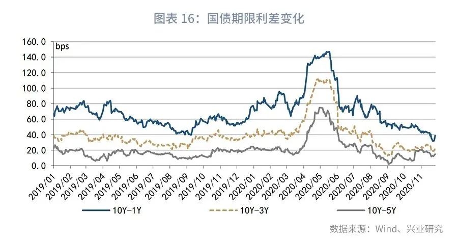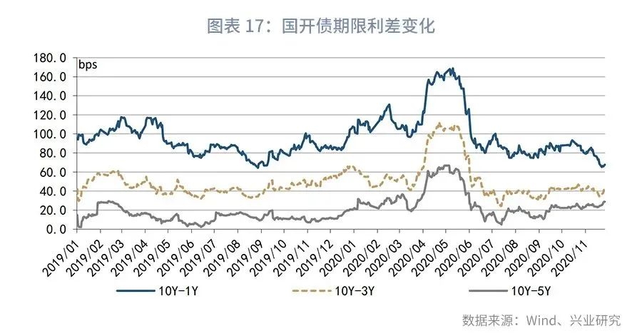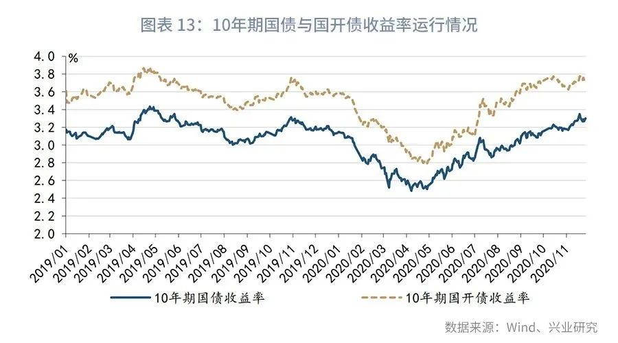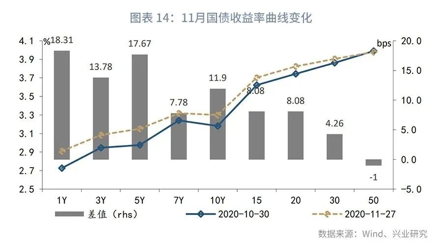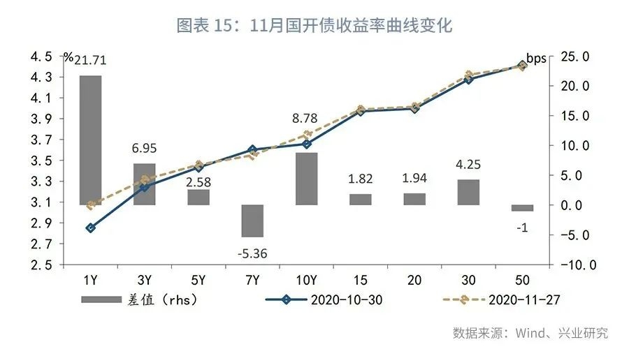 第一,11月长端收益率上行突破2019年第四季度高点3.3%。11月上旬,资金面边际缓和,债市延续10月以来的震荡格局。中短短国债和国开债收益率有所分化,长端方面国开债表现好于国债,显示交易情绪对国开债的支撑。中旬,部分地方国企信用违约事件扰动市场,资金面再次回到偏紧状态,长端利率品种快速调整,债市基本回吐10月中旬至11月上旬小幅交易反弹行情的盈利,国开债收益率上行幅度小于国债。进入第三周,信用违约事件持续发酵,初期表现为资金面的流动性风险和情绪冲击,在央行超额续作MLF后资金面边际缓解,但市场担忧情绪延续,叠加同业存单仍处提价通道引发短端利率大幅上行,长端利率7个交易日内上行13bps,突破2019年第四季度高点3.3%,违约风险对利率品种交易情绪的冲击成为收益率突破前期上行阻力的直接原因。下旬,随着国务院金稳委会议的表态和部分企业的自救行为,信用冲击对利率走势的影响逐步缓和,加之央行保持小额净投放,市场情绪明显有所修复,现券表现开始强于期货。但是,大宗商品上涨态势愈发强烈,南华工业品指数创出2012年以来新高。另一方面海外权益市场上涨明显,国内股市亦表现不俗,从大类资产角度而言,对债市并不友好。截止11月27日,较10月最后一个交易日,10年期国债收益率上行12bps至3.30%,10年期国开债利率上行9bps至3.75%。