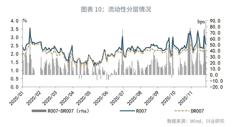 第一,11月中上旬资金面较为紧张,后在央行投放下有所缓和,全月资金利率波动较为明显。相较于10月底资金面的超预期收紧,11月初的资金面边际明显放松,隔夜及7天资金价格回落至2%下方,但逆回购操作的空窗使得资金面再次回到“紧平衡”的状态。中旬以后,资金面在央行投放偏向谨慎以及信用违约事件使得机构对于质押券融资风险的关注度提升的情况下再次偏紧,DR007自2月后首次突破2.6%,流动性分层状况显著加剧。随后在央行超额续作MLF后,资金面边际有所缓和。进入下旬,央行在公开市场保持小额高频净投放,加之财政资金释放,资金面延续较为宽松的态势,DR007再次回到2.2%下方。11月25日有机构在交易所市场大量融出资金,非银资金面亦得到了明显缓解。月末资金利率在跨月因素的影响下小幅上行。