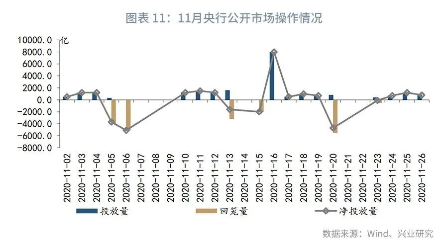 第二,央行延续超额续作MLF,全月公开市场操作实现净投放800亿元。11月央行保持“逆回购+MLF”的公开市场操作组合,逆回购操作上仍以“削峰填谷”为主,月中在有6000亿元MLF到期的情况下增量投放2000亿元长期限资金。20日后在信用违约事件持续发酵的情况下央行连续开展逆回购操作,小额高频投放资金,全月(截止11月27日)实现流动性净投放800亿元,显示对资金面的呵护态度。11月21日国务院金稳委强调要继续保持流动性的合理充裕,央行在第三季度货币政策执行报告中亦提及,“合理把握中期借贷便利、公开市场操作等货币政策工具的力度和节奏,保持短、中、长期流动性供给和需求均衡”,“既保持流动性合理充裕,不让市场缺钱,又坚决不搞“大水漫灌”,不让市场的钱溢出来“,预计后续央行仍将根据宏观形势和市场需要适时适度开展公开市场操作。