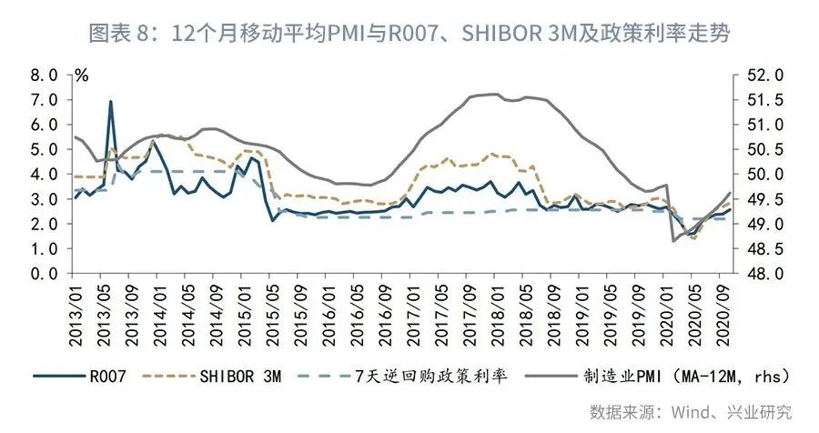 综合来看,制造业PMI作为衡量经济增长的关键指标,对观察货币政策的边际变化具有一定的信号意义。若其读数较长时间处于高景气或衰退区间,则货币当局有收紧或放松货币政策的可能,同时货币当局对PMI的连续下滑或跌破荣枯线或更为敏感。回到当下,制造业PMI自3月起便持续位于50以上的景气区间,至今已有8个月的时间,折射出强劲的修复动能。央行在 《2020年第三季度中国货币政策执行报告》中,将第三季度供需格局总结为“供给基本恢复、需求加速改善”,相较于第二季度的“供给快速恢复、需求逐步改善”,显示出货币当局对于当前经济形势的判断更加乐观。